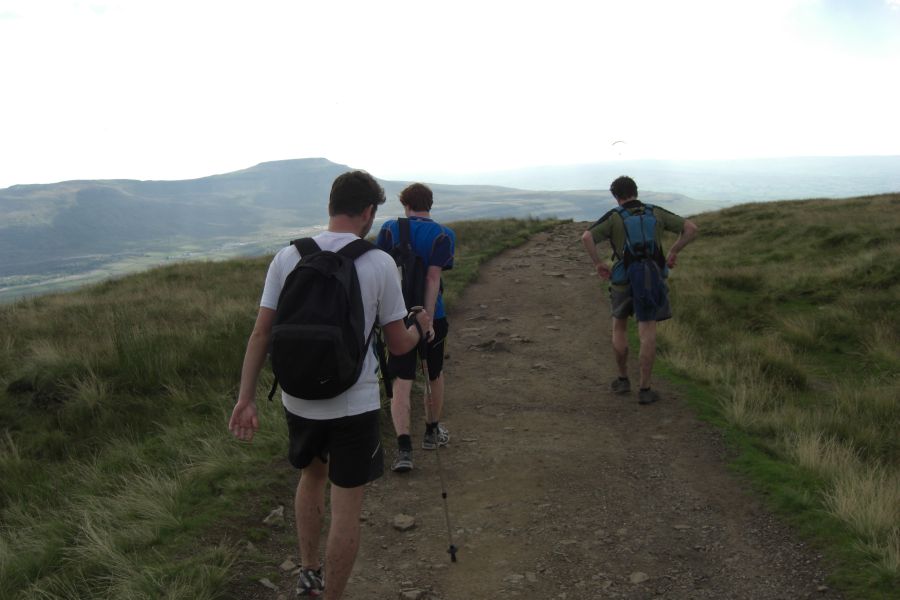 Setting off to Ingleborough with hangliders above us.