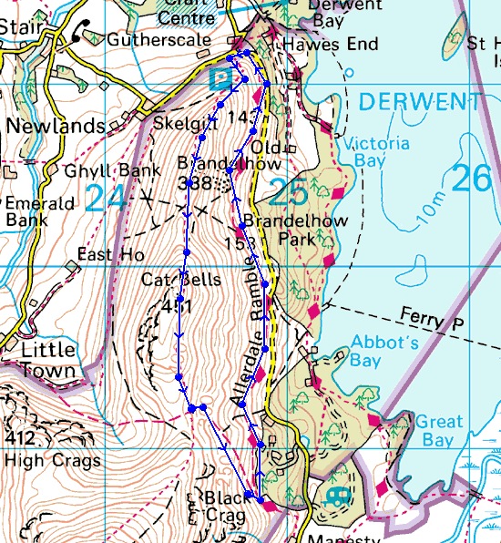 the rocks. The first peak reached is Brandlehow at 388 metres. from