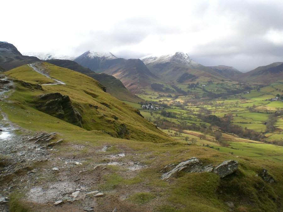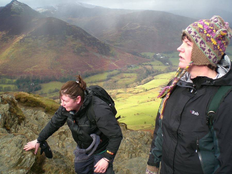 walk. A snow capped Causey Pike from the start of the climb to Cat Bells A glint of sun in the valley below Tracey and Jaq take a breather on a steepr than expected ascent. Cat Bells straight ahead with Maiden Moor in the background. The path to the top!!! Derwent water with keswick in the background Very changeable weather !! The path we have just walked accross Stepping onto the summit Starting the descent The other end of the rainbow The path back to Hawes End A double rainbow over Derwent Water Back to top of page |