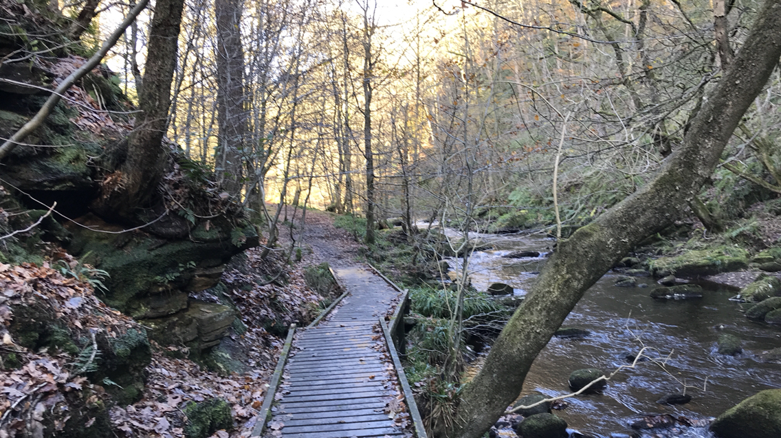 ![]() On route to the start of the walk at Clough Hole ![]() Decending from the car park, fallen leaves a plenty ![]() I shall be returning on the other side of those trees ![]() Down by The river (Hebden Water) and Gibson Mill, now a place for refreshments. Lovely spot ![]() The path follows the left bank of Hebden Water ![]() The River is crossed several times, over footbridges or stepping stones ![]() Nice wooden walkways keep your boots clean ![]() Sunny reflections on the River ![]() Rugged and ancient paths ![]() Autumn colours ![]() Stepping stones to cross the river ![]() Having completed the 5 mile circuit, I approach Gibson Mill on the right hand bank, although I'm on the stepping stones in the middle of the river here ![]() Hebden Bridge, from the road on the way home. Back to top of page