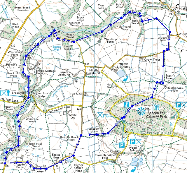 River bank to the car park and picnic area at Higher Brock Bridge.